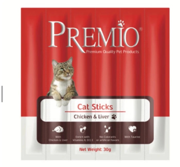 חטיף פרמיו סטיק לחתול. בטעם עוף וכבד חטיף שהחתול לא יכול לעמוד בפניו ובעל טעימות אדירה