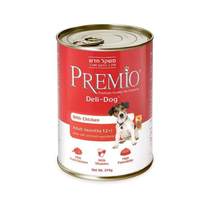 שימורי פרמיו לכלב מזון משלים לכלבים, פטה עוף. שימורי מזון משלים לכלבים גורים בגיל 12 חודשים ומעלה. המזון מועשר בוויטמנים ומינרלים.