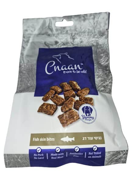 חטיף כנען נגיסי עור דג חטיף איכותי לכלבים המגיע בצורת נגיסים רכים. ארוז בשקית עם פס הרמטי לשמירה על טריות המוצר. משקל אריזה 60 גרם.