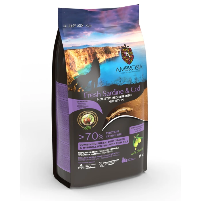 אמברוסיה ים תיכוני 1.5 ק"ג כלב סניור, לייט, סטרלייז, דגים סגול