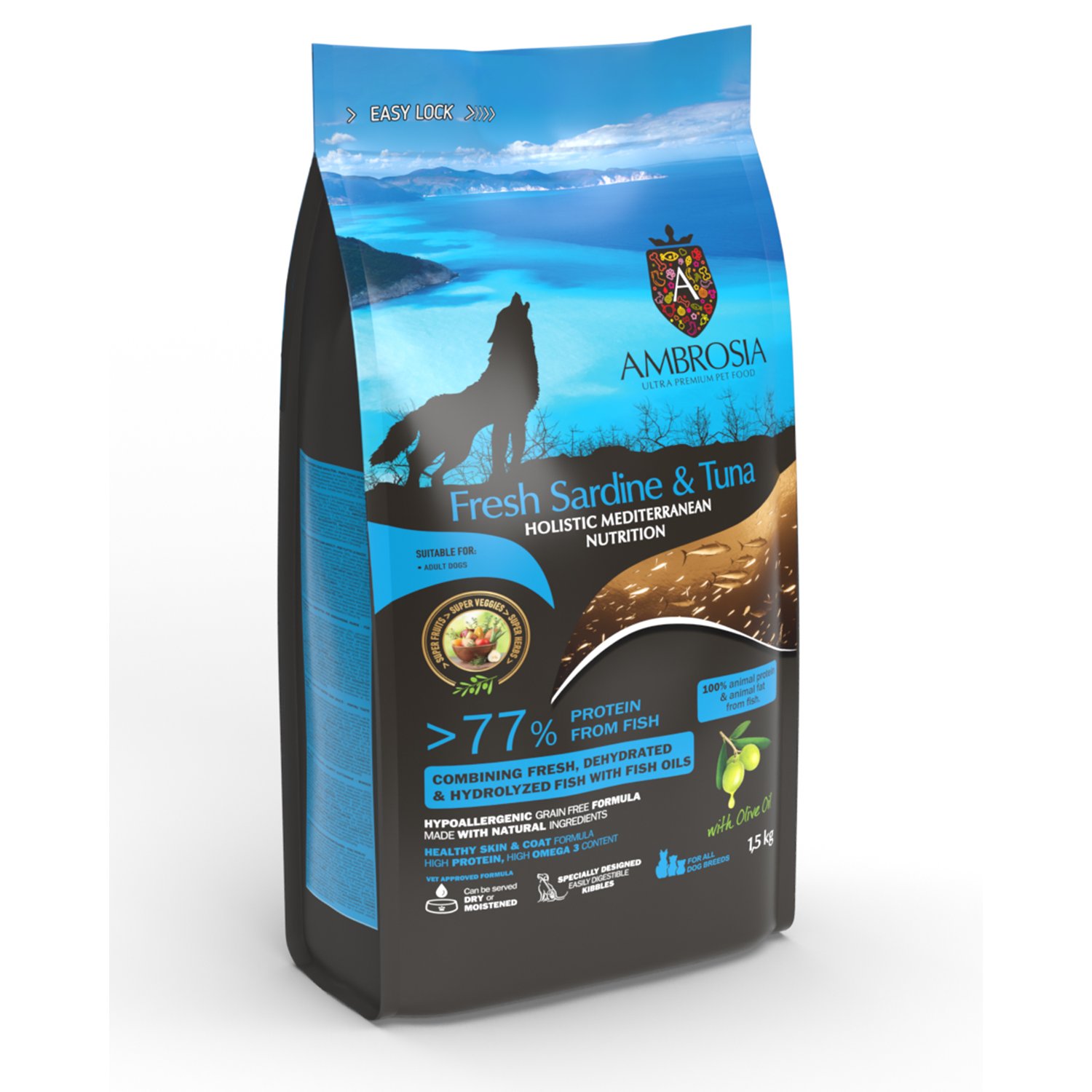 המתכון שלנו של אמברוסיה עם סרדינים וטונה טריים משלב חלבון דגים קל לעיכול המגיע מפילה סרדינים טרי יחד עם חלבון איכותי מטונה. עם הכמות המושלמת של שמן זית ותערובת של פירות ועשבי תיבול ים-תיכוניים, אנו מציעים מזון כלבים היפואלרגני
