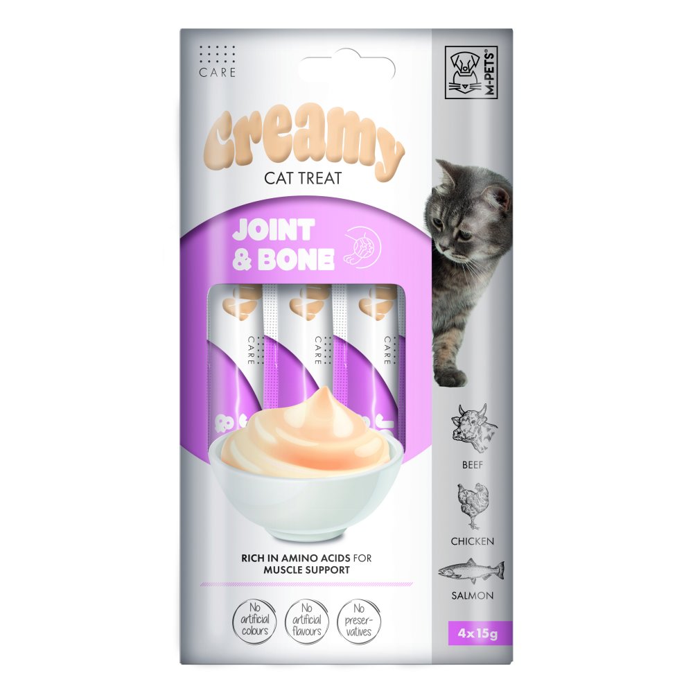 עצמות חזקות לחתול חזק! חטיף קרמי Joint & Bone עם בקר, עוף וסלמון, עשיר בחומצות אמינו לתמיכה בבריאות העצמות והשרירים.